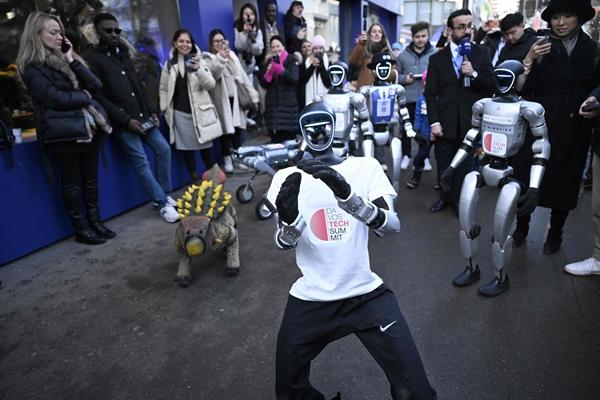 1月21日,瑞士达沃斯,世界经济论坛2026年年会期间,中国科技企业推出的优必选G1人形机器人在达沃斯街头“行走”展示。视觉中国供图