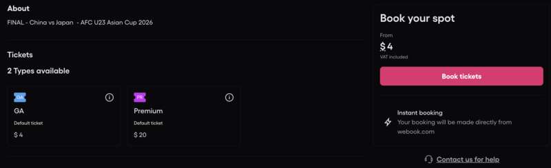 U23亚洲杯官方票务平台Webook上,中日决赛票价实惠。Webook官网截图