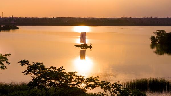 吴昊之制作的帆船行驶在湖面上。受访者供图