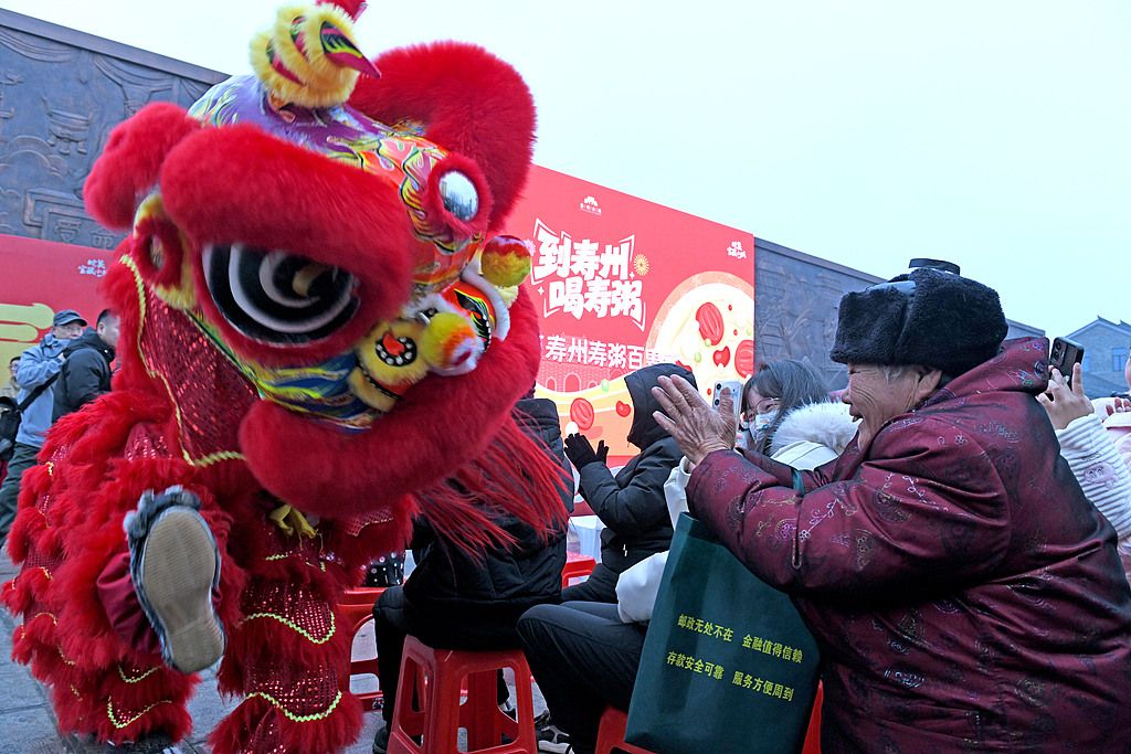 2026年1月26日,安徽省淮南市,市民、游客在寿县古城免费品尝腊八粥。当日是腊八节,安徽省淮南市寿县举行腊八节寿粥百叟宴活动,邀请市民、游客免费品尝2000份腊八粥,推介寿县独具特色的“寿”文化。