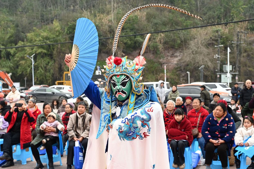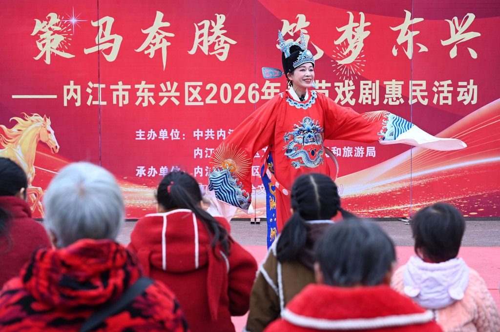2026年1月28日,四川内江,东兴区川剧团的文化志愿者在永兴镇永兴社区为群众表演川剧节目。