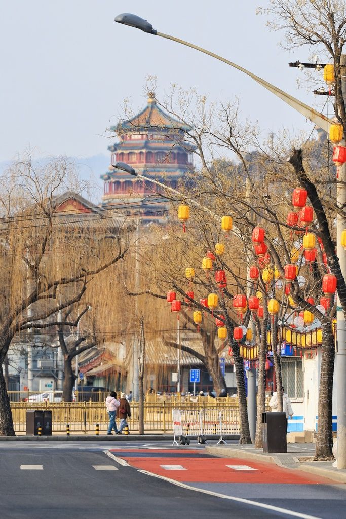 2026年1月28日,北京海淀区,同庆街年味渐浓。工人们在街道两旁的树枝上挂起红灯笼,红黄相间的灯笼与古色古香的街景相映成趣,为冬日的京城增添新春气息。