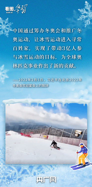 “让更多人参与到冰雪运动中来,是奥林匹克运动的题中之义。”习近平总书记高度重视我国冰雪运动的普及、推广和发展,指出中国筹办举办冬奥会和推广冬奥运动的重要意义,在于“让冰雪运动进入寻常百姓家,实现了带动3亿人参与冰雪运动的目标”,要“把群众冰雪运动热情保持下去”。