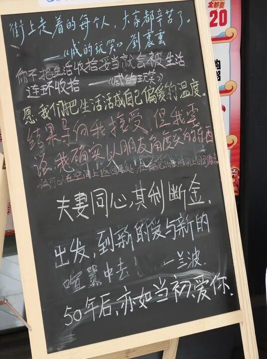 这些黑板上的文字碰撞,妙就妙在它的“慢”与“拙”,带来真实的活人感。字迹或工整或潦草,内容大多是日常感慨,有时还有错别字。有考生写下“数学好难”,下面跟着“坚持住”;有人感慨“妈妈的菜总过期,是我们回来晚了”,接龙区很快排满“我也常让妈妈等”“下次多陪她吃顿饭”。还有人画个笑脸,抄几句歌词。每个字、每句话,没有滤镜,不求回应。它就像在喧嚣街边,意外发现一条宁静小巷,信步走进去,心就静了。