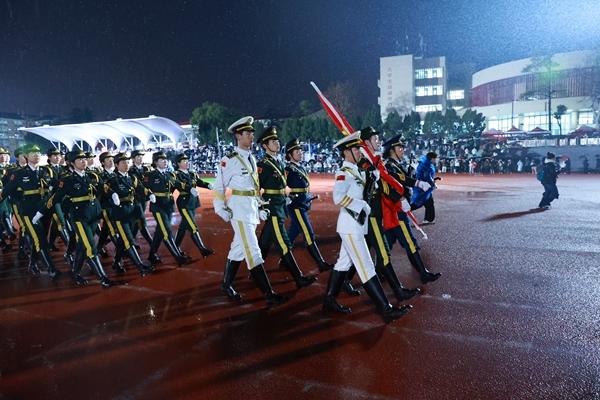 “五星红旗迎风飘扬……”新年的零点时分,嘹亮的歌声准时在中国地质大学(武汉)校园内响起。56名身穿各族服饰的学生托举起一面五星红旗,与全场两万名师生齐唱《歌唱祖国》,歌声穿透雨幕,响彻校园。