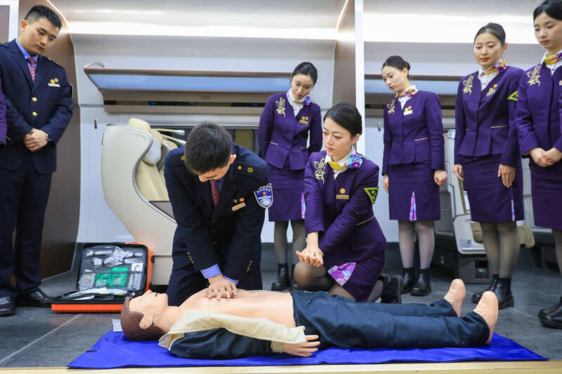 1月28日,江苏南京,“紫金号”G66次列车乘务班组进行急救培训。春运将至,铁路南京客运段围绕服务礼仪、客运业务、设备设施使用、应急处置等方面开展针对性培训,为即将到来的春运打牢基础。视觉中国供图