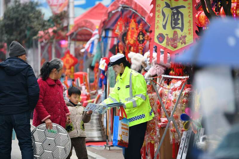 1月29日,安徽省阜阳市阜南县公安局交管大队宣教辅警在地城镇年货集市上向群众宣讲春运出行安全知识。2026年春运临近,返乡人员逐渐增多,阜南县公安局交管大队组织宣教民警辅警抓住村镇逢集人员出行集中时机,开展春运交通安全宣传预热活动,提高群众文明、安全出行意识。视觉中国供图