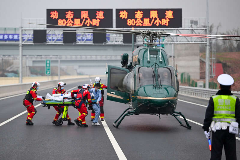 1月29日,G42沪蓉高速成南段,参加演练的消防救援人员将一名重伤者送上直升机转送医院救治。2026年春运临近之际,四川省多部门联合在此处,开展全要素、全实战的应急救援综合演练。视觉中国供图