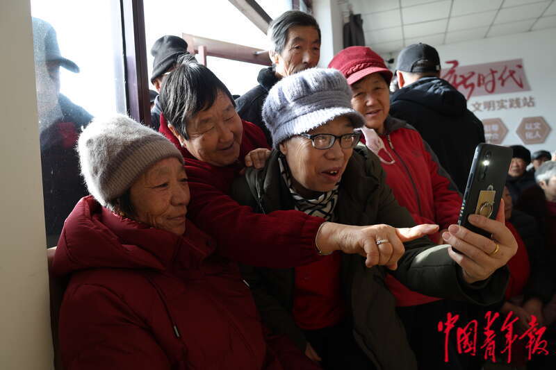 1月30日,朱日和镇新民嘎查幸福院老人拍摄苏尼特右旗乌兰牧骑的精彩演出。中青报·中青网记者 石佳/摄