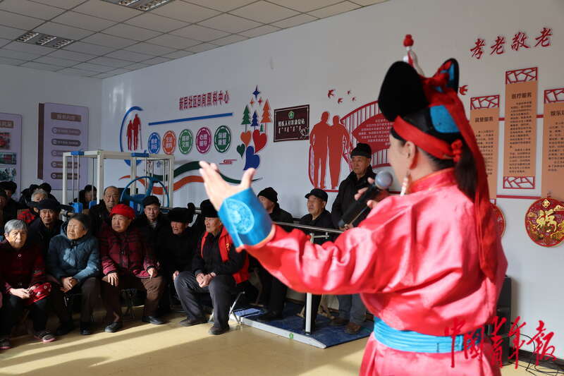 1月30日,在内蒙古锡林郭勒盟苏尼特右旗朱日和镇新民嘎查幸福院,乌兰牧骑带来表演。中青报·中青网记者 石佳/摄