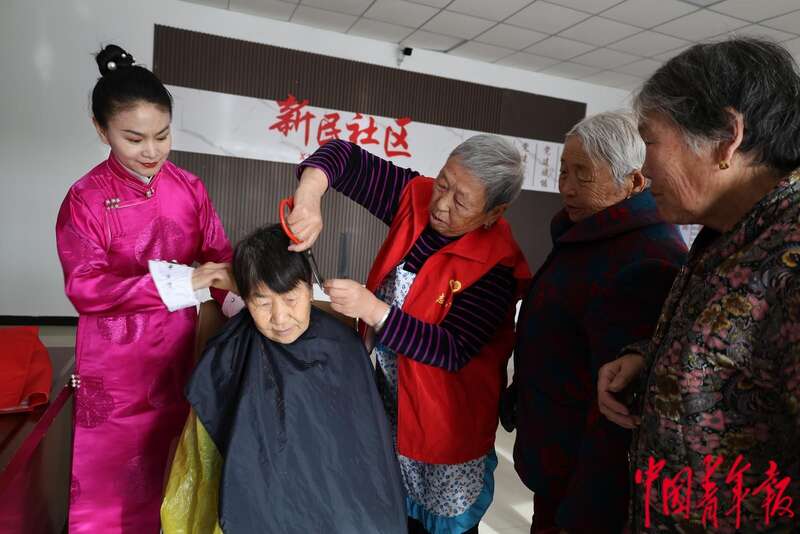 1月30日,苏尼特右旗乌兰牧骑队员帮着朱日和镇新民嘎查幸福院老人理发。中青报·中青网记者 石佳/摄
