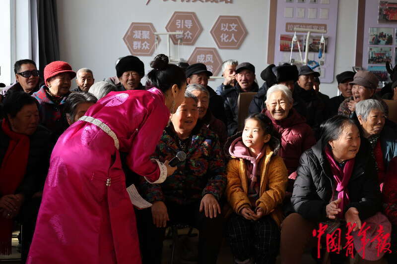 1月30日,苏尼特右旗乌兰牧骑与朱日和镇新民嘎查幸福院老人互动。中青报·中青网记者 石佳/摄