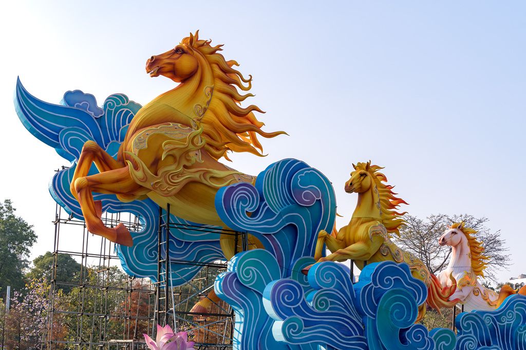 2026年1月27日,广东广州,2026广州马年新春灯会即将亮灯。图为广州越秀公园2026马年新春灯会的农历马年主题“万马奔腾”巨型主灯灯卷灯组。