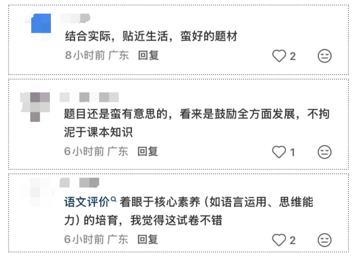 还有家长认为,这是学科融合和本地化落地的体现,预判未来的考试将更注重情境化、生活化、本土地域文化性。