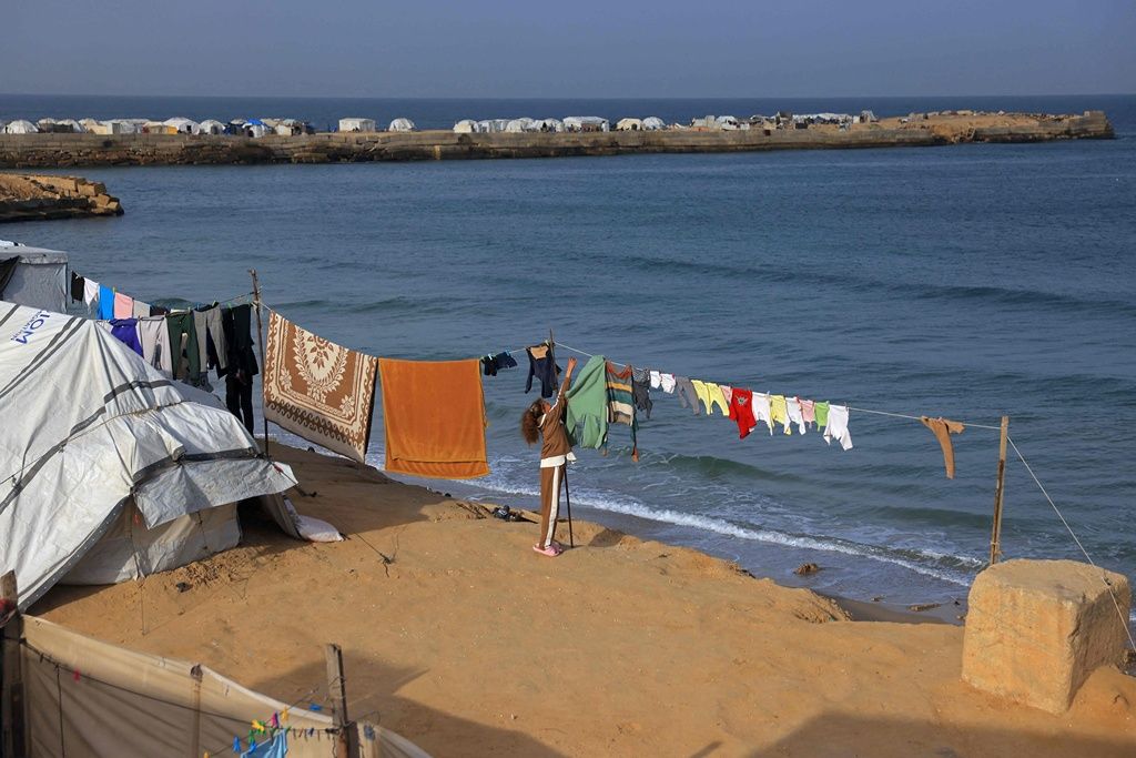 当地时间2026年1月30日,加沙地带南部汗尤尼斯马瓦西地区,一名流离失所的巴勒斯坦妇女在帐篷外晾晒衣服。美国斡旋的停火协议旨在阻止以色列和哈马斯之间因哈马斯2023年10月袭击而引发的冲突,尽管双方都指责对方一再违反协议,但停火已持续三个多月。