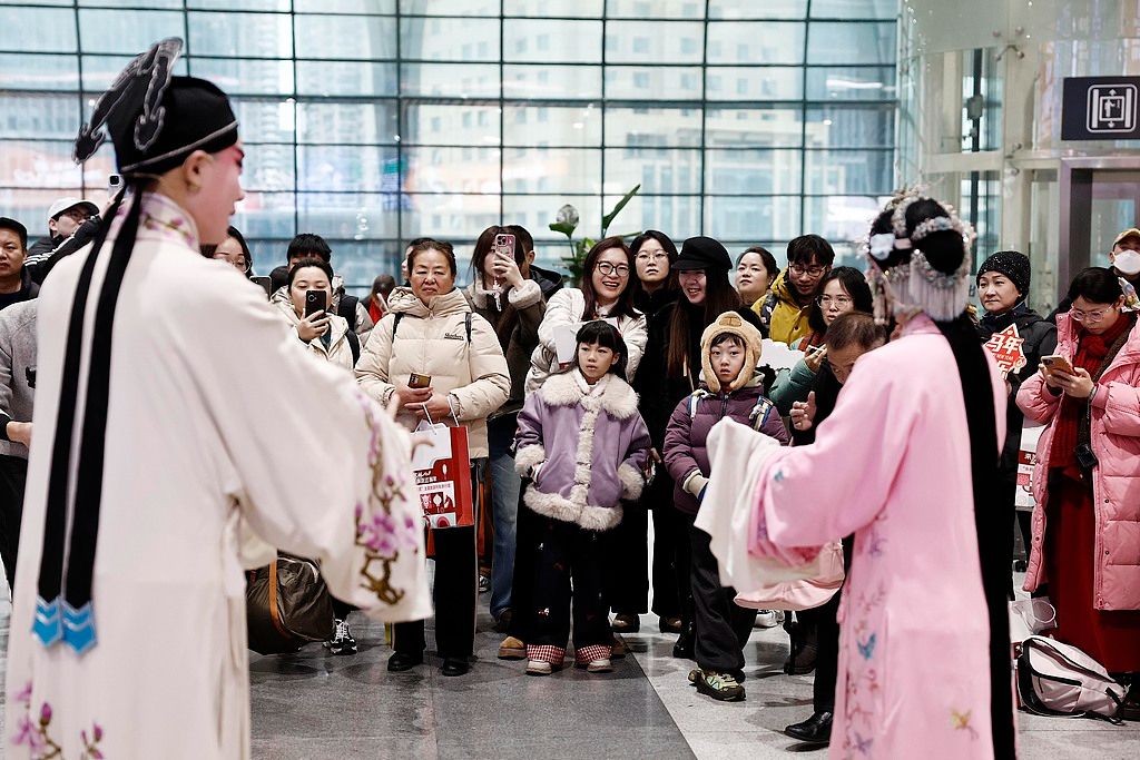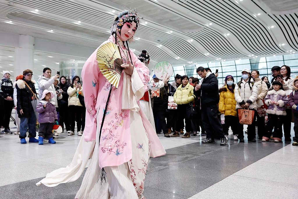 2026年1月31日,演员在铁路上海站候车大厅表演昆曲《牡丹亭》的经典选段《游园惊梦》。 中新社记者 殷立勤 摄