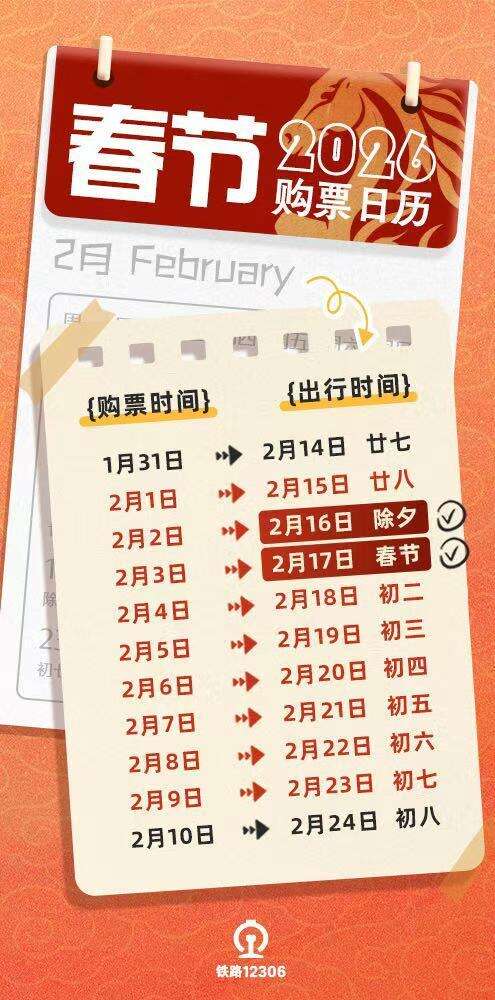 今年春节假期及连休日是2月15日到2月23日,共计9天。2月1日可以购买春节假期首日(2月15日)的火车票,假期最后一天2月23日的返程火车票将于2月9日开售。
