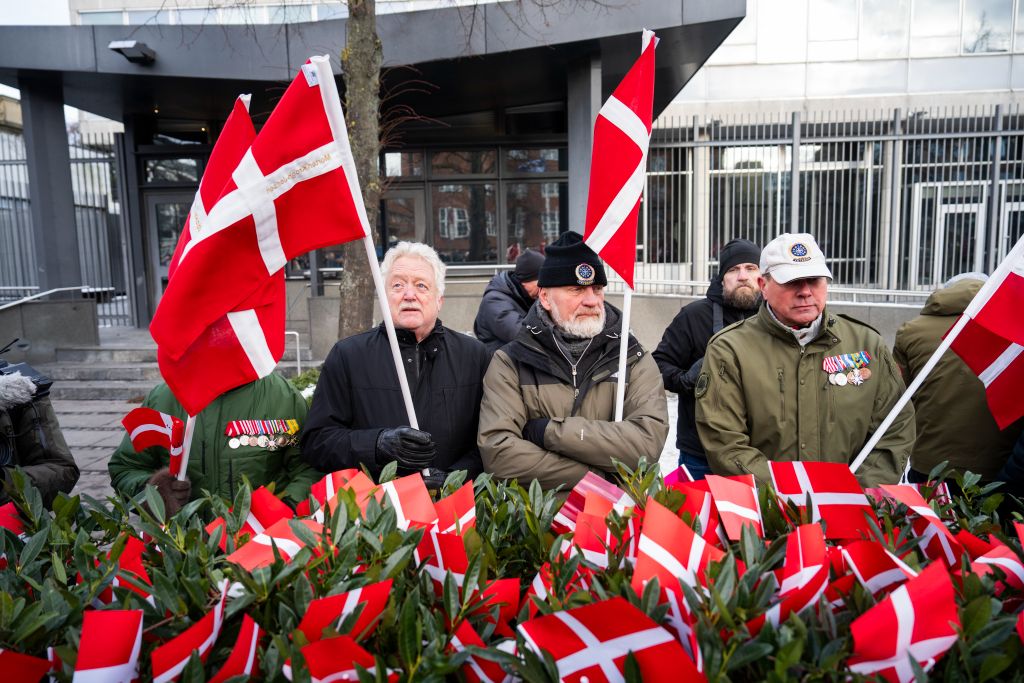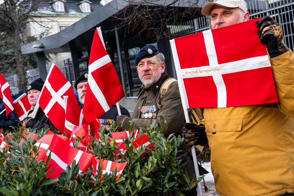 当地时间2026年1月31日,丹麦哥本哈根,丹麦退伍军人手持写有在阿富汗和伊拉克阵亡的丹麦士兵姓名的旗帜,在美国驻哥本哈根大使馆外举行示威。以抗议特朗普有关北约盟友“脱离前线”言论。近几天来,活动人士在美国驻哥本哈根大使馆外放置了丹麦国旗,上面写有在阿富汗阵亡的丹麦北约士兵的姓名。大使馆工作人员最初移除了这些旗帜,引发了丹麦公众的更多强烈反对,此时美丹两国因特朗普对收购格陵兰岛的兴趣而关系紧张。此后,大使馆已恢复了这些旗帜。
