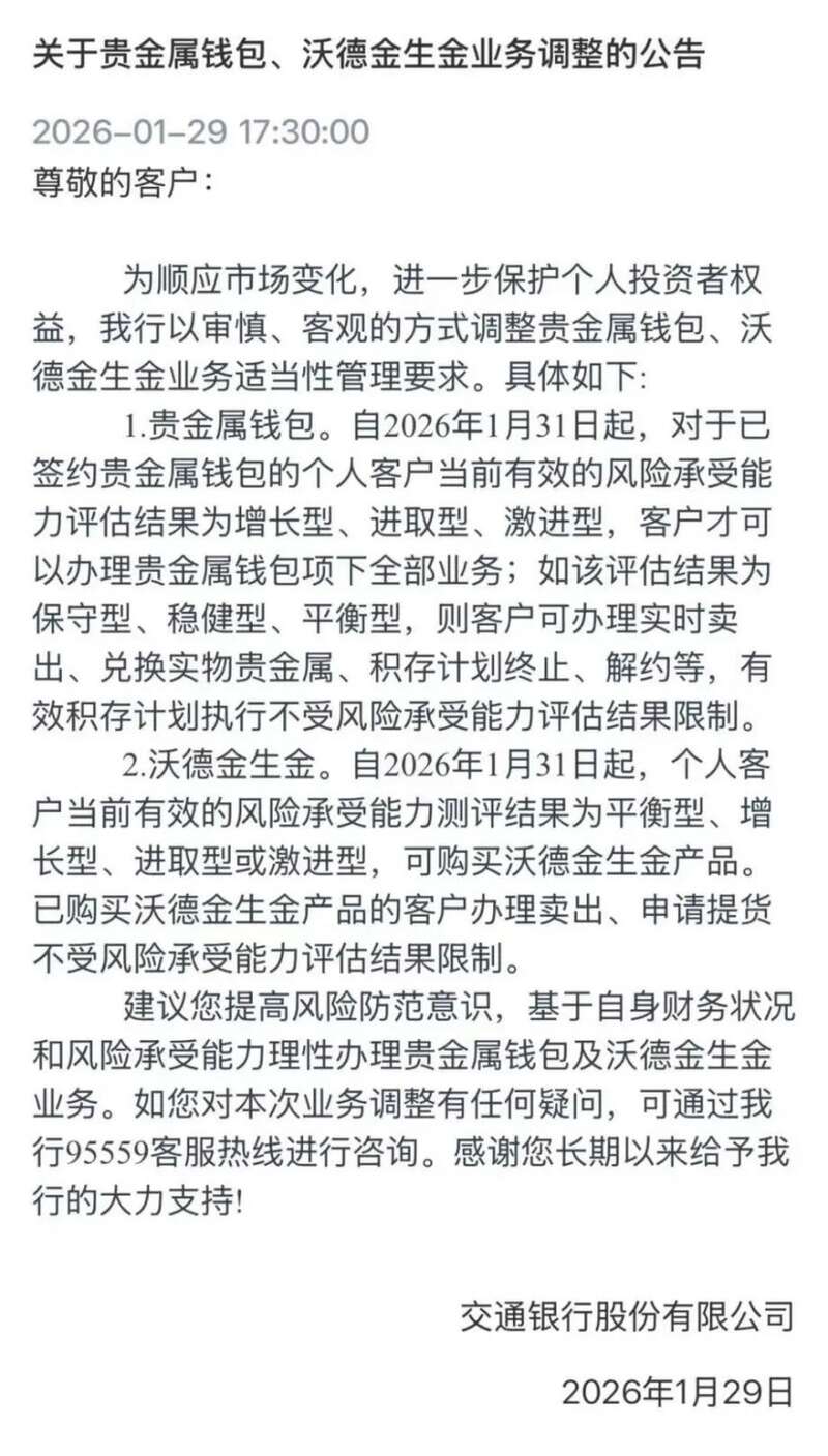 交通银行于1月29日发布公告称,自1月31日起,对于已签约贵金属钱包的个人客户,当前有效的风险承受能力评估结果为增长型、进取型、激进型,才可以办理贵金属钱包项下全部业务;如该评估结果为保守型、稳健型、平衡型,则客户可办理实时卖出、兑换实物贵金属、积存计划终止、解约等,有效积存计划执行不受风险承受能力评估结果限制。