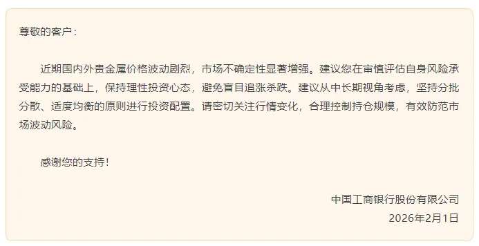 2月1日,工商银行提示,近期国内外贵金属价格波动剧烈,市场不确定性显著增强。建议投资者在审慎评估自身风险承受能力的基础上,保持理性投资心态,避免盲目追涨杀跌。建议从中长期视角考虑,坚持分批分散、适度均衡的原则进行投资配置。请投资者密切关注行情变化,合理控制持仓规模,有效防范市场波动风险。
