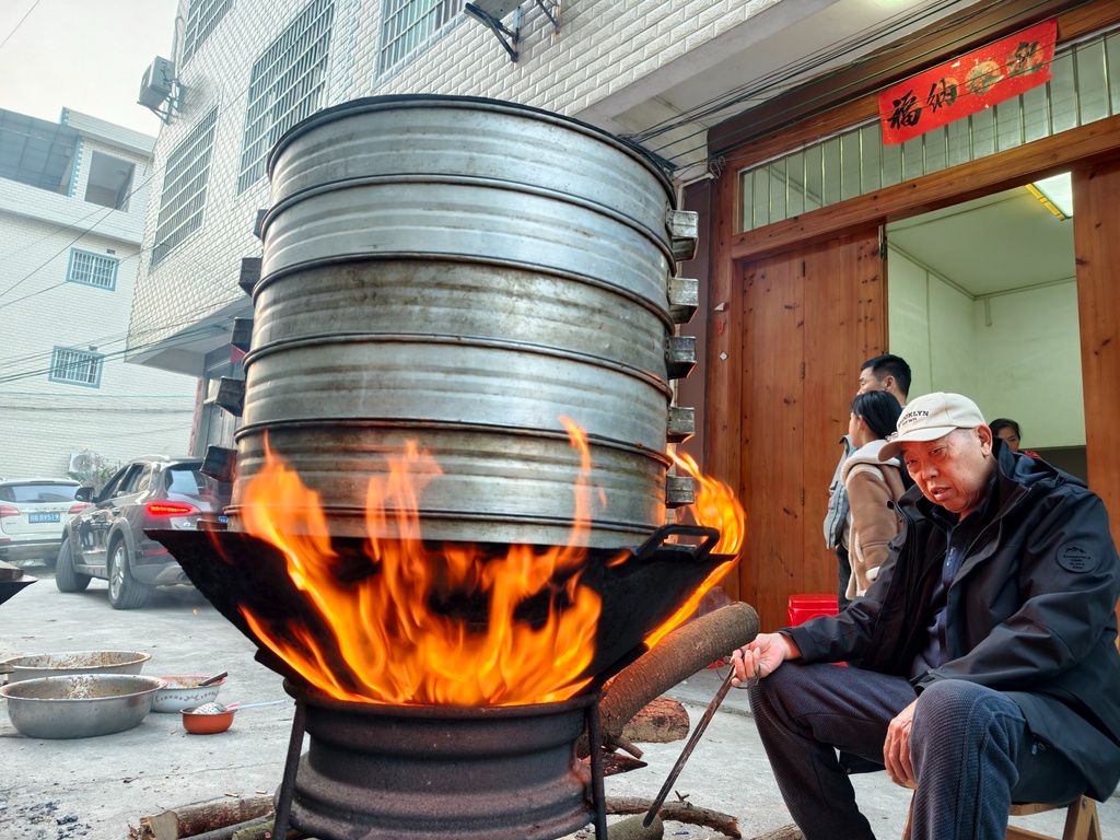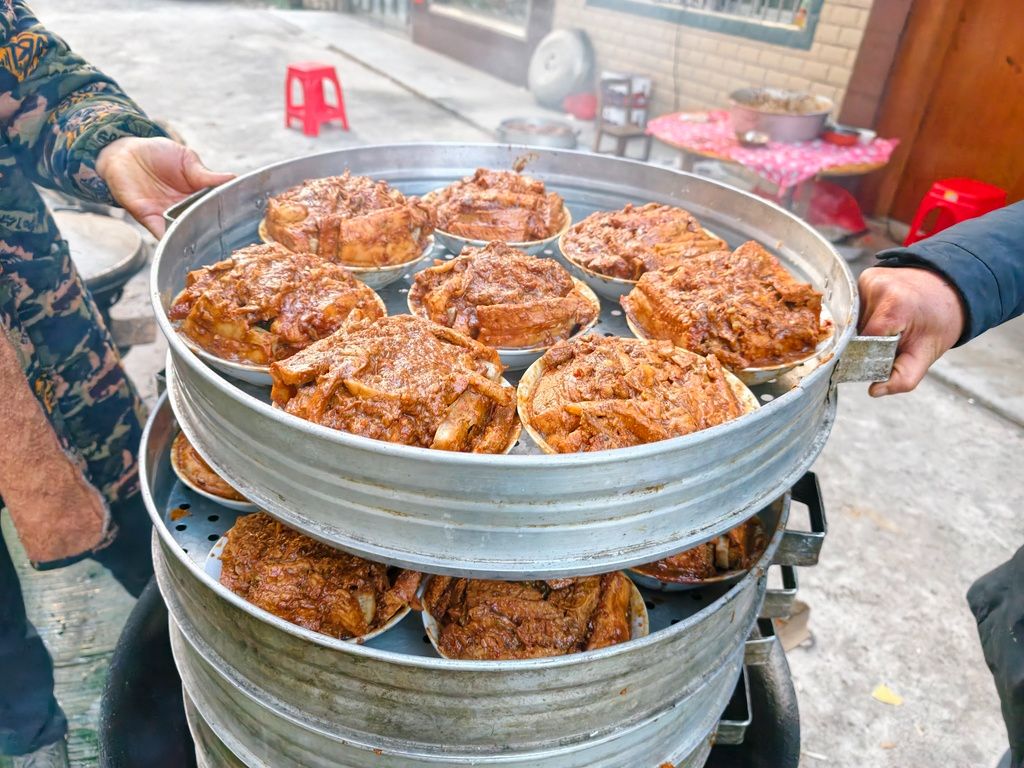 2026年1月31日,在广西荔浦荔城镇兴宁巷,民众在蒸“荔浦扣肉”。