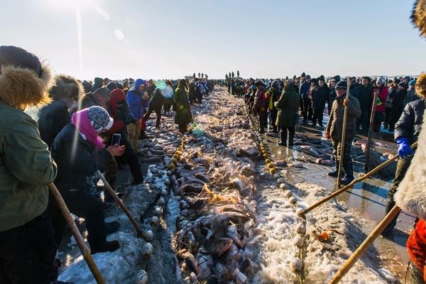 找准位置后,冬捕工序依次进行:先凿出宽一米、长两米的下网眼;规划弧形网道,每隔15米凿一个冰眼,陆续打出300多个冰眼;随后穿杆走网,10多米长的穿杆带着渔网从下网眼放入,渔工们用走钩穿过冰眼推送穿杆,让渔网在冰下呈扇形铺展;合网围鱼后,便到了最激动人心的时刻。随着马拉绞盘,渔工们喊着号子合力辅助,千余米长网缓缓出冰,又是一幅冰湖腾鱼的画面。