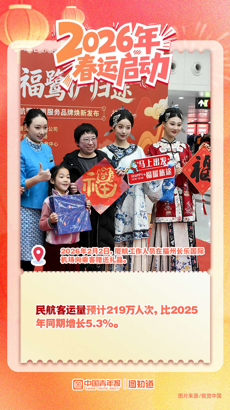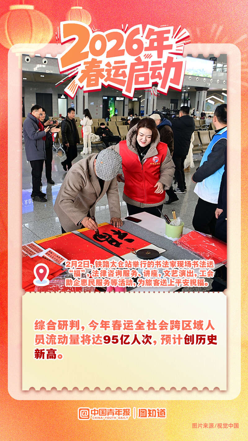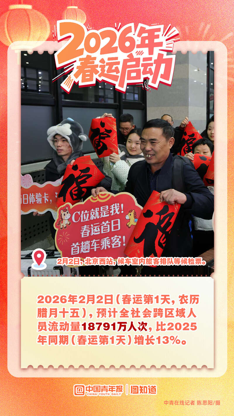 2月2日,为期40天的春运拉开帷幕。据预测,今年春运期间全社会跨区域人员流动量将达95亿人次。从北国雪原到南疆海岸,从西部边陲到东海之滨,流动的中国正以蓬勃的活力绘制着世界上最壮观的迁徙图景。在这场世界最大规模的人口流动中,我们既看到游子归乡的迫切脚步,也见证了中国经济社会的强劲脉动。愿所有奔赴都平安抵达,所有等待都温暖相拥。