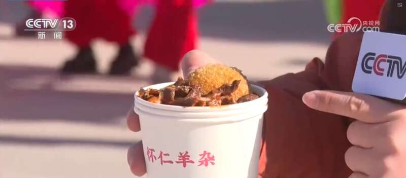 记者手中的这碗羊杂是当地的一道特色风味小吃。除了食材新鲜外,关键还在它上面飘着的红油,就是用红辣椒面炒制的汤底,鲜辣爽口。