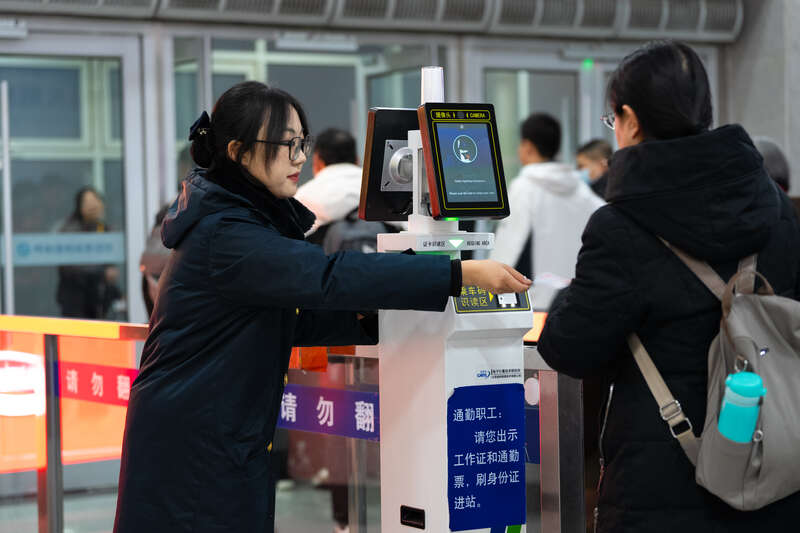 2月2日,春运首日,呼和浩特东站客运人员正在为旅客查验车票。杨颐/摄