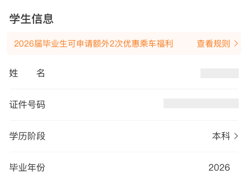 2026届普通高等学校毕业生,在完成身份核验后,可在毕业学年额外享受2次单程学生优惠票购票次数,也就是在原有每学年4次单程学生优惠票的基础上,额外增加2次,本学年可享受单程学生优惠票购票次数合计6次。