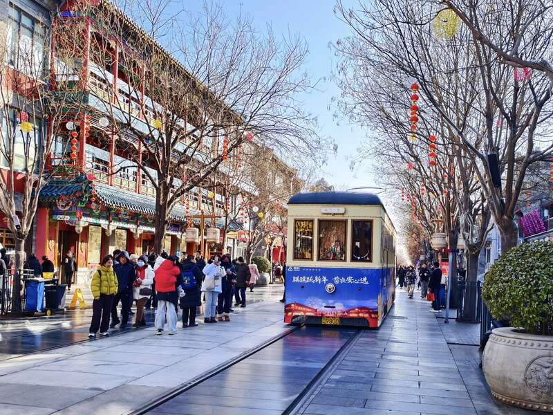 2月2日,北京,复古铛铛车穿行于前门大街,沿街红灯笼高高挂起。中青在线记者 郭艳丽/摄