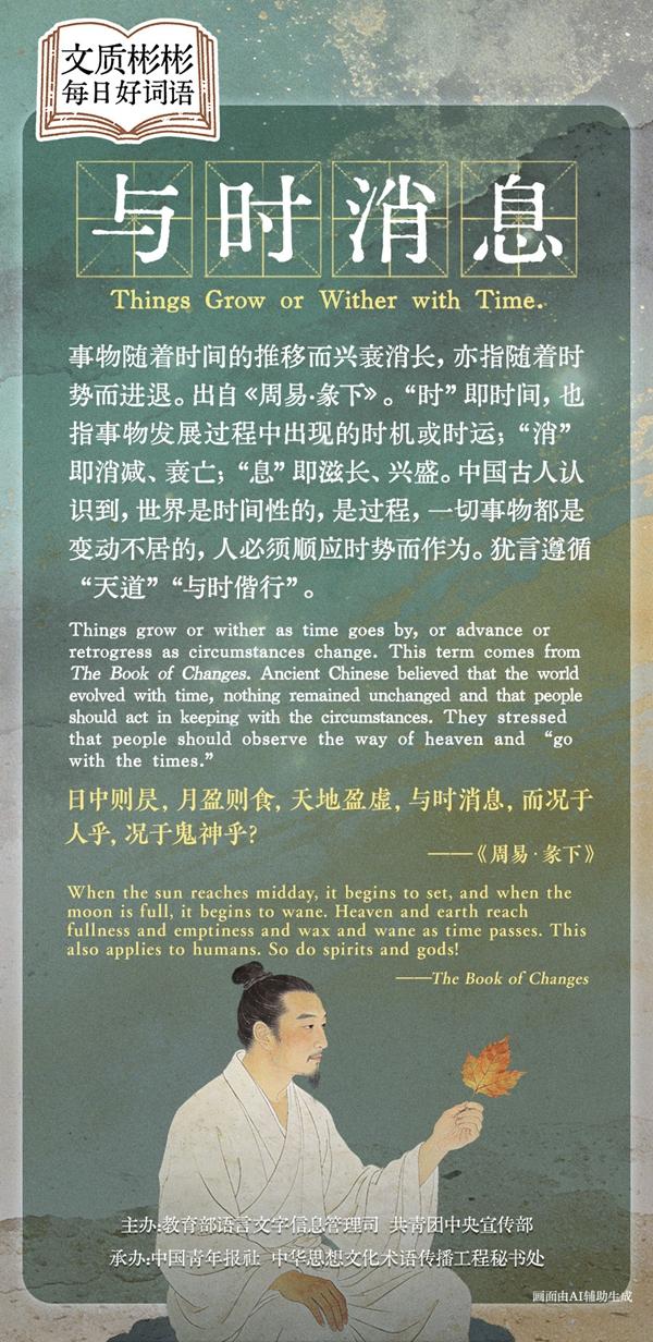 Things grow or wither as time goes by, or advance or retrogress as circumstances change. This term comes from The Book of Changes. Ancient Chinese believed that the world evolved with time, nothing remained unchanged and that people should act in keeping with the circumstances. They stressed that people should observe the way of heaven and "go with the times."