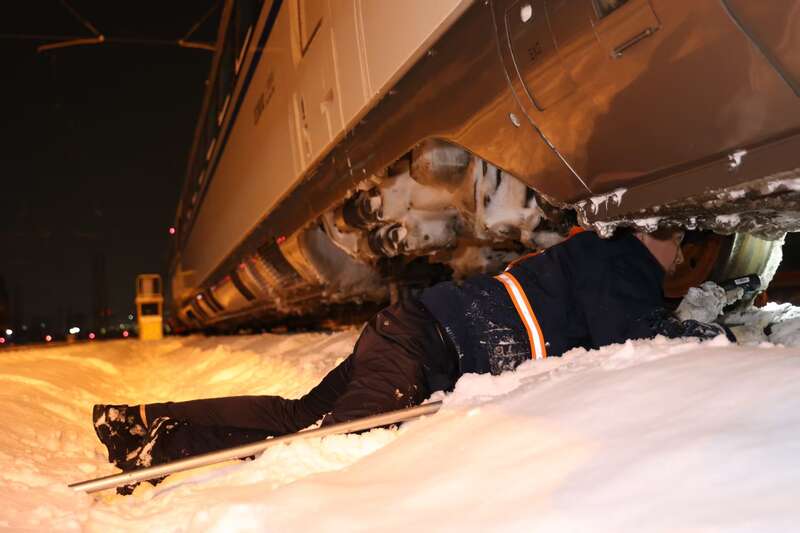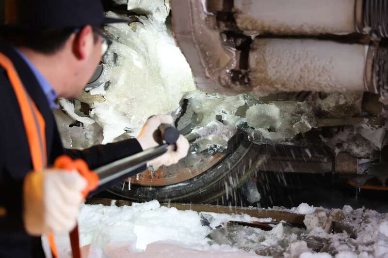 低头往车底看,转向架制动夹钳等设备冻成了一整块,部分结冰已跟钢轨接触。准备多时的“扫雪除冰突击队”带上除冰棒、除冰铲、橡胶锤等工具,拉开“破冰行动”大幕。为了提高除冰效率,他们分头行动,下腰、俯身、后仰,不断变换着姿势在车下忙碌着。
