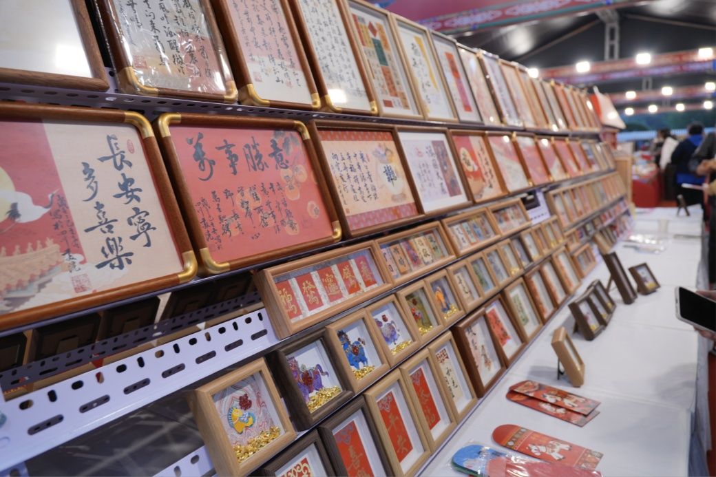 四川美术学院张春涛的书画作品就是其中之一。他创新地将粉红、粉绿、粉紫等“多巴胺”色系融入书法作品背景,设计的书画摆台题材丰富,文案兼顾不同年龄段人群的需求,精准捕捉了现代人的情绪气息。“通常书法作品很少用这类鲜艳色彩,我们将其植入背景,给人耳目一新的感觉,也很适配新年氛围。”张春涛说道。此外,市民游客还可邀请张老师对书画作品进行个性化定制,为自己打造一份独一无二的新春祝福。