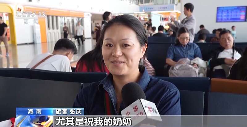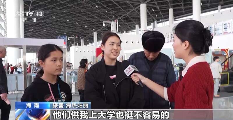 旅客 海热姑丽:这次我带了爸爸、妈妈、小姨,还有小姨的女儿一起来海南。以前都是我回新疆过年。他们供我读大学很不容易,我现在已经上班了,攒了一点钱带他们来这边旅游。