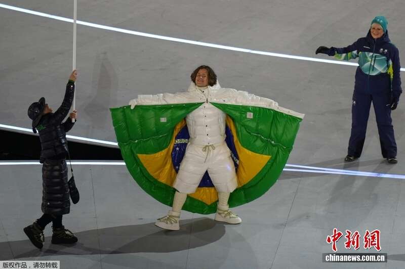 当地时间2月6日,巴西高山滑雪运动员卢卡斯·布拉滕在米兰冬奥会开幕式上掀起羽绒服,亮出巴西国旗图案。
