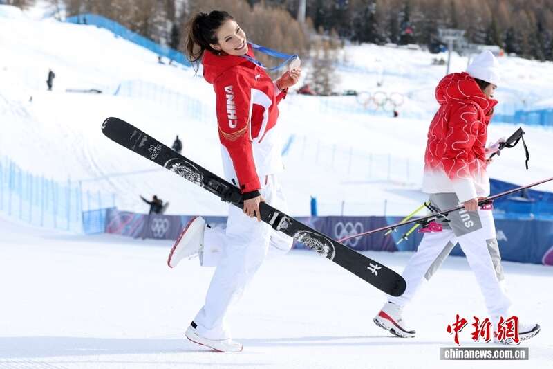 当地时间2月9日,米兰冬奥会自由式滑雪女子坡面障碍技巧决赛在意大利利维尼奥雪上公园举行。中国选手谷爱凌(左)摘得银牌,赛后面对镜头俏皮一下。