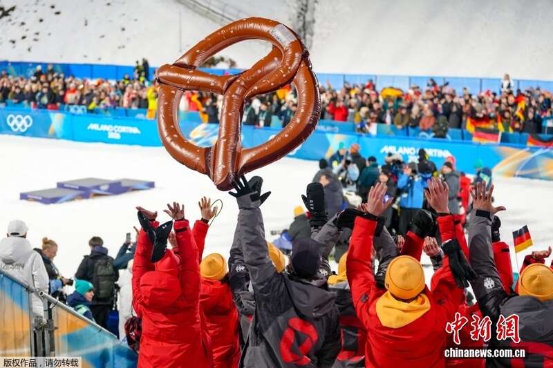 当地时间2月9日,德国选手菲利普·雷蒙德夺得米兰冬奥会跳台滑雪男子个人标准台冠军,队友将一个硕大的充气椒盐卷饼抛向空中庆祝。