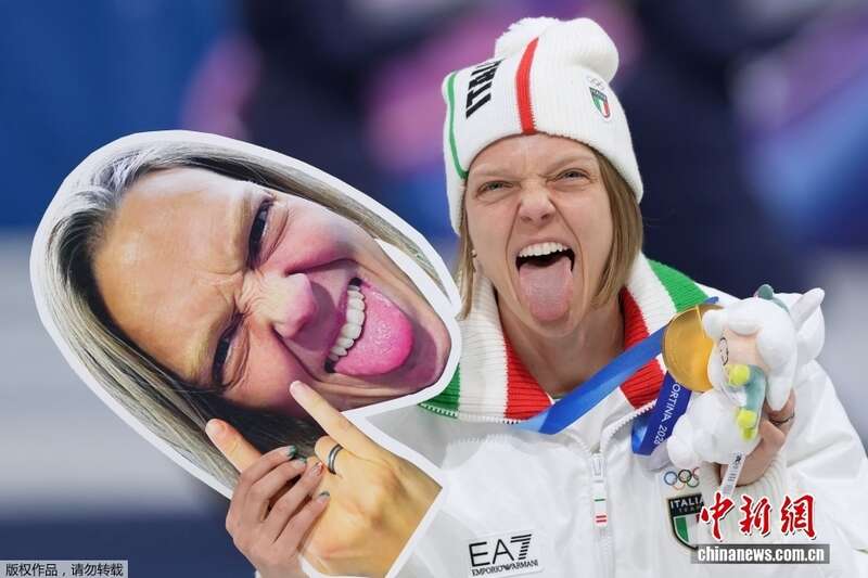 当地时间2月10日,意大利队在米兰冬奥会短道速滑混合团体接力赛中获得金牌,六战冬奥的意大利名将阿里安娜·方塔纳赛后摆出俏皮模样。