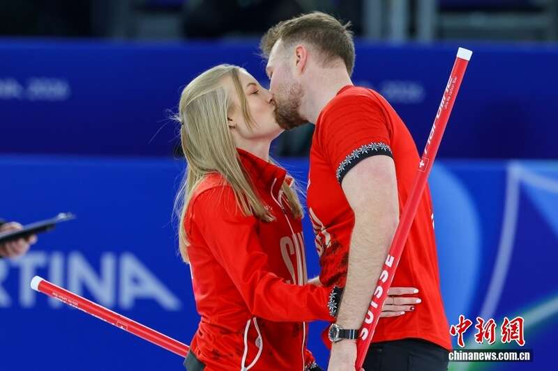 当地时间2月5日晚,米兰冬奥会冰壶混双循环赛场次4的比赛举行,瑞士队选手施瓦勒夫妇在比赛结束后亲吻,解锁“赛场撒糖”名场面。