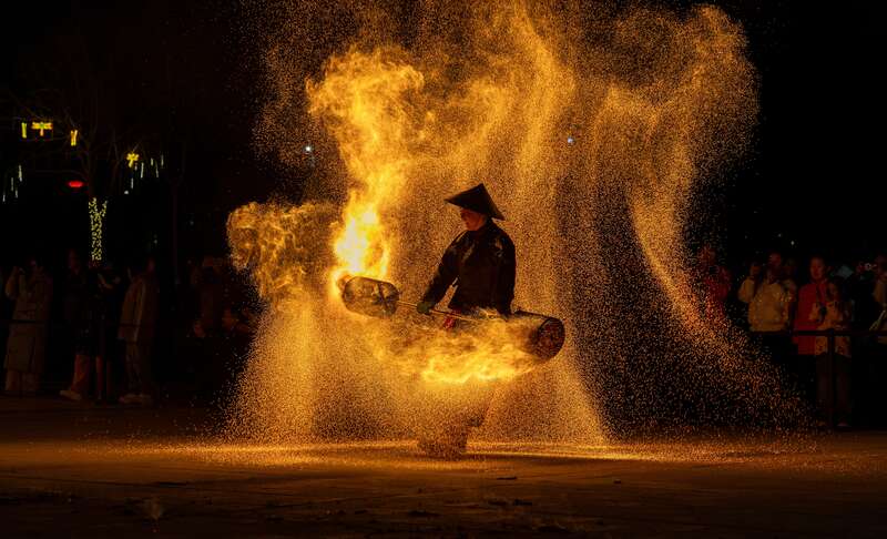 夜幕降临,“丝路同乐·夜游雄关”活动同步举行,夜间的新春游园会设置不倒翁、编彩绳等趣味项目,火壶、变脸喷火等非遗绝技表演,铁花四溅与灯光交相辉映,为群众打造一场精彩的视觉盛宴。