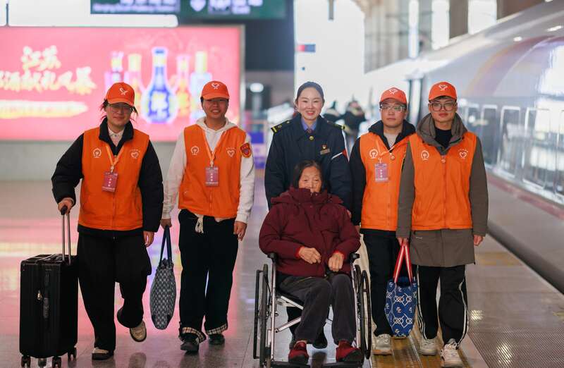 “把每位旅客当家人,是我们和车站师傅们共同的信念。”春运南京站志愿服务团队学生负责人孙家硕说。春运伊始,一位行动不便的老奶奶走进南京站“158”雷锋服务站,其乘坐的列车即将发车,老人心急如焚。孙家硕见状立即上前,与车站工作人员默契配合,小心翼翼推着轮椅穿越人潮,全程耐心安抚、仔细核对信息,仅用8分钟便将老人安全送至车厢门口。这份默契,正是双方日常联合培训与实战磨合的成果。