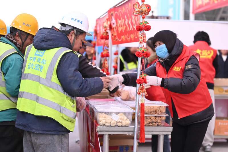 “在工地上还能赶上这么贴心的集市,真是没想到!”来自湖北的模板工周师傅提着刚买的糕点、春联和特产,笑容满面,“东西实在,气氛也好,感觉年已经到身边了。”