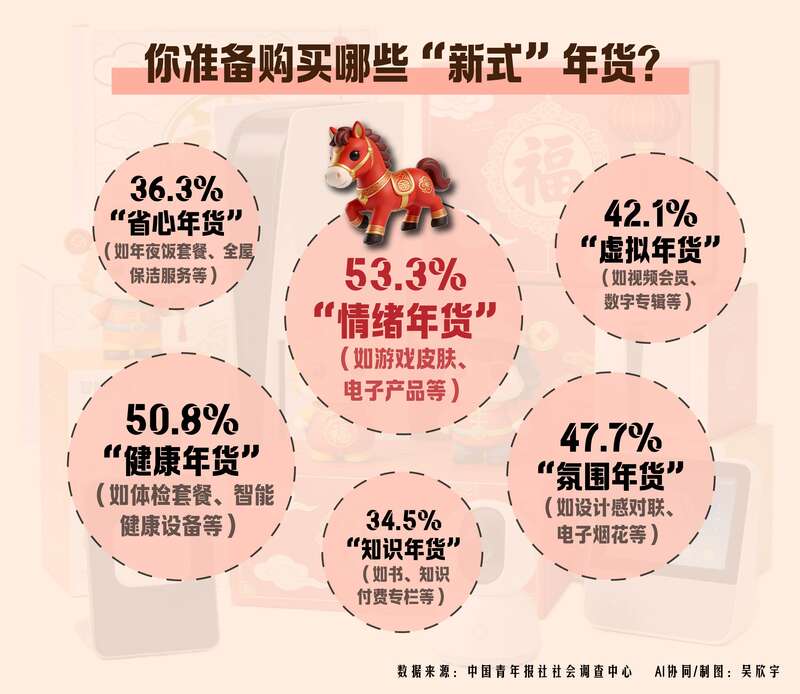 春节临近,社交媒体上掀起一股“新式”年货分享潮。除了传统的食材、礼品礼盒,各种“电子年货”、潮玩好物开始出现在年轻人的年货清单上。近日,中国青年报社社会调查中心联合问卷网(wenjuan.com)进行的一项有1335名受访者参与的调查显示,超九成(95.4%)受访者准备购买“新式”年货。为自己买的“情绪年货”(53.3%)、送给家人的“健康年货”(50.8%)是更受青睐的“新式”年货。