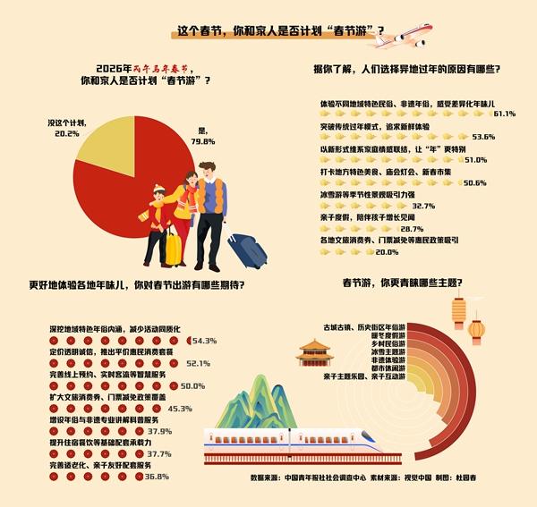 日前,中国青年报社社会调查中心联合问卷网(wenjuan.com),对1000名受访者进行的一项调查显示,这个春节,79.8%的受访者和家人会“春节游”。选择异地过年,61.1%的受访者是为了体验不同地域特色民俗、非遗年俗,感受差异化年味儿;53.6%的受访者觉得是突破传统过年模式,追求新鲜体验。