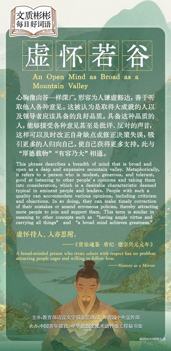 This phrase describes a breadth of mind that is broad and open as a deep and expansive mountain valley. Metaphorically, it refers to a person who is modest, generous, and tolerant, good at listening to other people's opinions and taking them into consideration, which is a desirable characteristic deemed typical in eminent people and leaders. People with such a quality can accommodate various opinions, including criticism and objections. In so doing, they can make timely correction of their mistakes or amend erroneous policies, thereby attracting more people to join and support them. This term is similar in meaning to other concepts such as "having ample virtue and carrying all things" and "a broad mind achieves greatness".