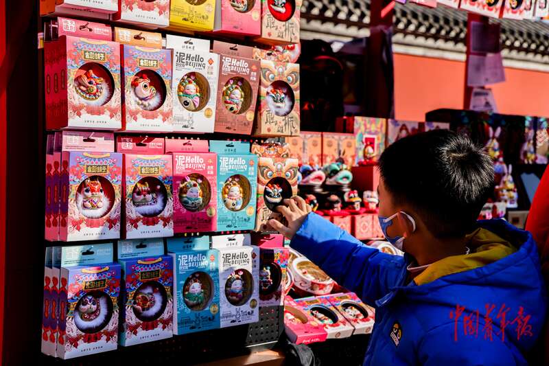 2月18日,北京北顶娘娘庙庙会,摊位上醒狮造型的冰箱贴吸引了小朋友的注意。中青报·中青网记者 陈思阳/摄