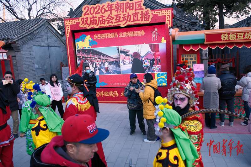 2月18日,北京东岳庙庙会,直播大屏将东岳庙庙会与北顶娘娘庙庙会“有机联动”,构建起“东岳看北顶,北顶望东岳”的双向互通场景,引导游客互访体验。中青报·中青网记者 田嘉硕/摄