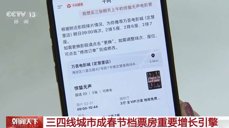 如今,在春节假期看电影已经成为越来越多基层群众的新年俗。今年春节档,全国多座三、四线城市票房表现都很突出,成为拉动整体票房的核心动力。据票务平台数据显示,三、四线城市已连续三年成为春节档票房的绝对主力。除了影片内容更贴合地域偏好等传统原因,今年春节档,AI购票的全新方式也让 购票更加便捷。今年春节档,山东滨州、辽宁阜新、内蒙古赤峰等三、四线城市影院跻身全国影院票房榜前六名。随着我国电影市场持续向纵深发展,“下沉”市场在春节档展现出了不俗的消费潜力。