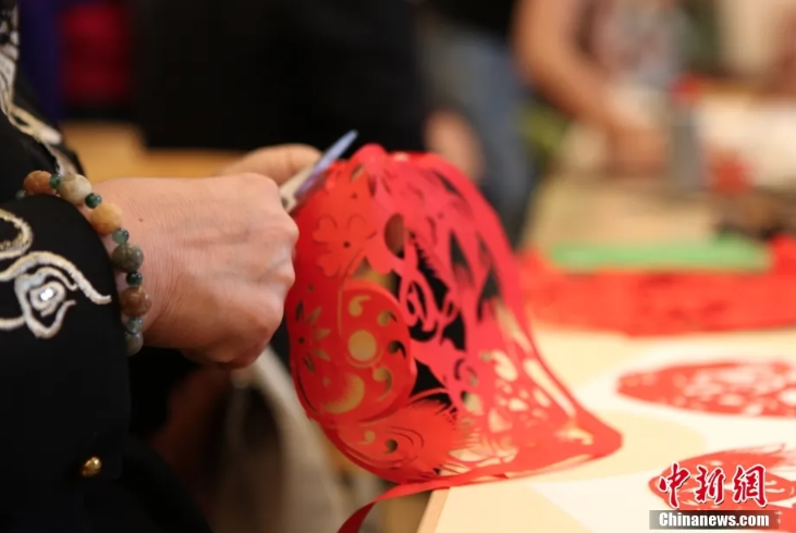 艺术家展示剪纸技艺。(资料图)中新社记者 德永健 摄